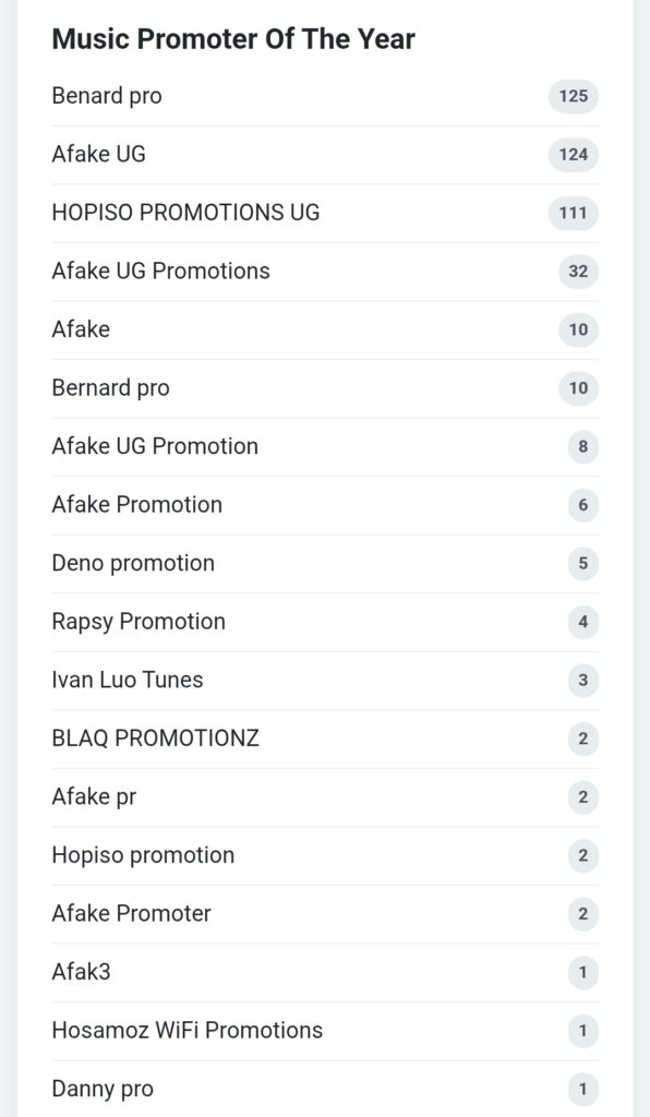 But after proper consultation with APAMUSICAWARDS2025 TEAM, The wrong spellings and Nicknames will be considered. So after doing the math we see Promoter Afake UG leading with 185 Nominations and Promoter Benard with 135 Nominations, Congratulations to the both of them and to Hopiso Promotions at the third place with Deno Promotions (Pader) and then Blaq Promotions