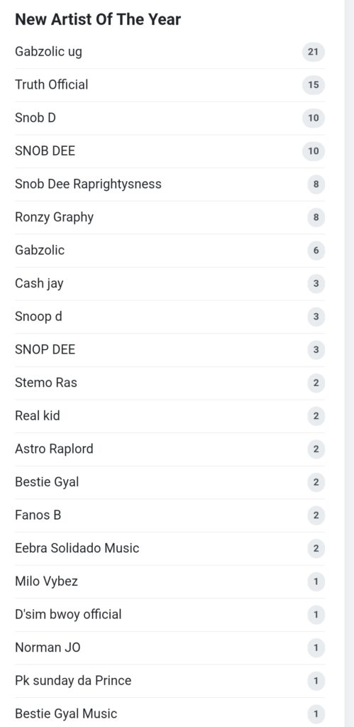 However the toughest battle of nominees this year is seen with Promoter of the Year As the saying goes, practice what you preach, if you can Promote yourself then you can promote me. With Our very own Promoter Benard Leadin with 125 nominations, closely following we see Promoter Afake UG